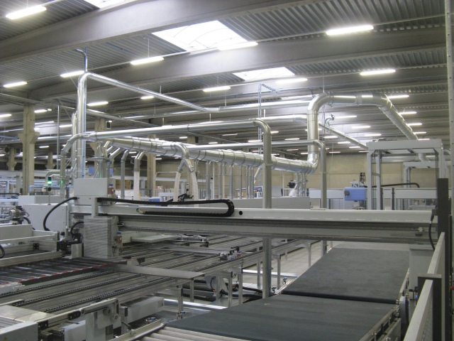 Moyennant la réorganisation de leurs machines existantes + l'arrivée d'une nouvelle ligne de panneaux, ils ont investi dans une nouvelle installation de dépoussiérage de Typhoon. Dans un premier temps, nous avons raccordé la nouvelle ligne de panneaux (capacité d'extraction de 44.000 m³/h). Ensuite, les conduites existantes ont pu être enlevées de telle sorte que leur installation de filtration actuelle a pu être retirée.